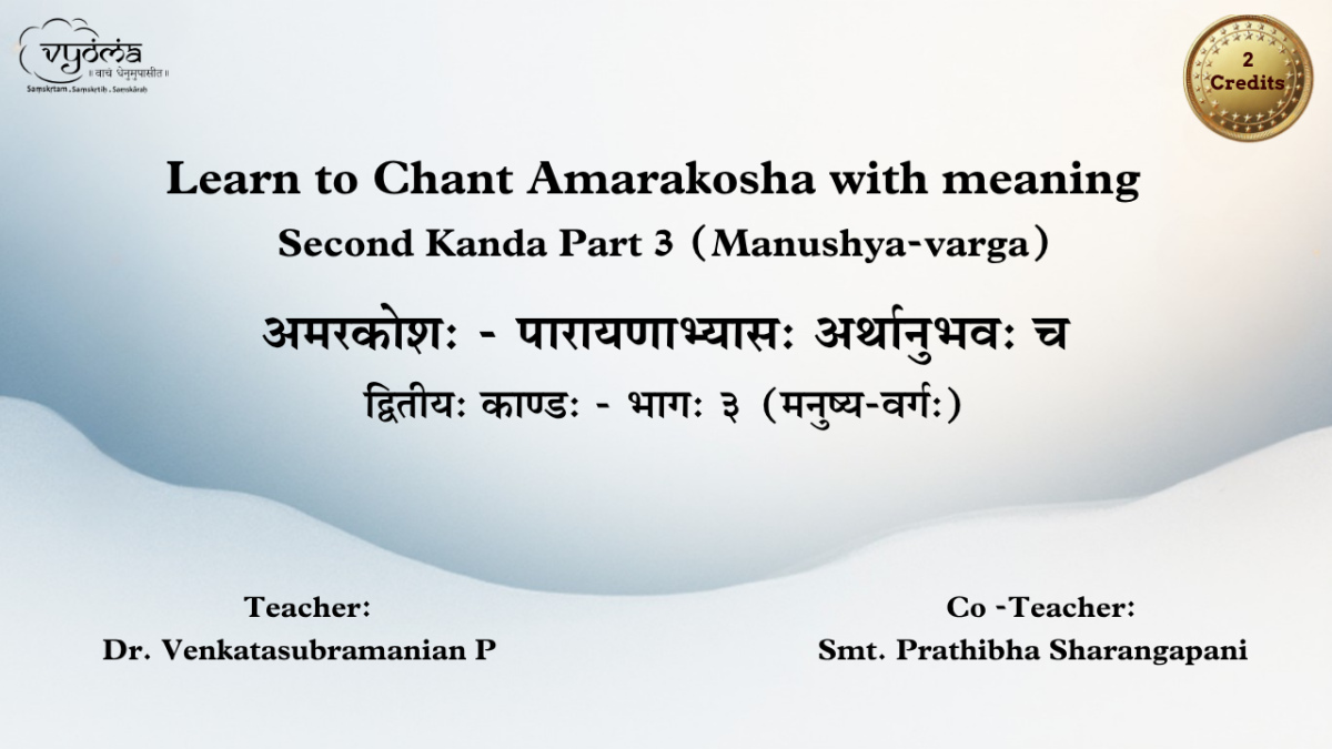 The Amarakosha, compiled by Amarasimha, is one of the most celebrated and widely referred lexicon in Sanskrit literature. This course introduces students to the Manushya Varga from the second Kanda of the Amarakosha, which presents synonyms and classifications related to human beings, their identities, relationships, occupations, stages of life, and qualities. Under the guidance of Dr. Venkatasubramanian P, learners will engage in guided recitation and reading practice, gaining a deeper understanding of Sanskrit vocabulary connected to human life. Through this, they will strengthen their pronunciation, comprehension, and appreciation for the linguistic richness of the Amarakosha.