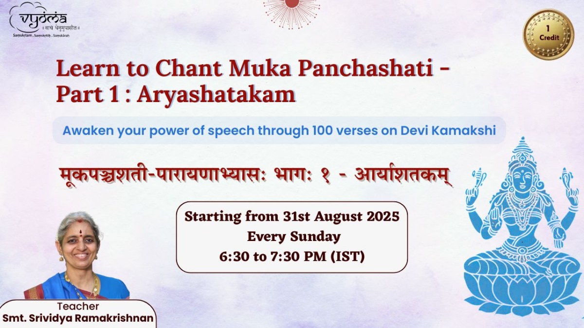 Mukapanchashati was composed by Sri Muka Shankarendra Saraswati, the 20th Acharya to adorn Sri Kanchi Kamakoti Peetham. Born without the ability to hear or speak, the Acharya was miraculously blessed with the power of speech through the grace of Goddess Kamakshi. With heartfelt devotion, he then composed 500 exquisite verses in praise of the Goddess, which came to be known as the Mukapanchashati. In this course, Smt. Srividya Ramakrishnan will explain the first 100 beautiful verses called "Aryashatakam".