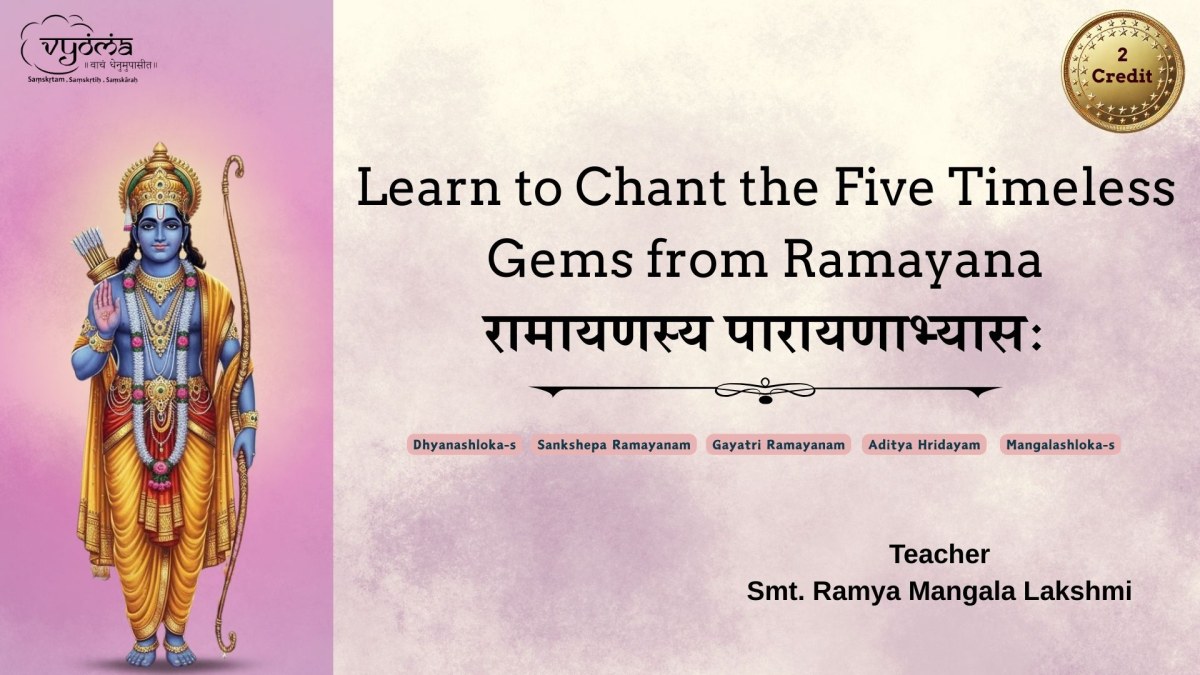 The Ramayana, a timeless epic, continues to illuminate and guide countless lives, offering treasures of wisdom and devotion. From this vast ocean, this course brings together a collection of its most treasured gems Dhyanashloka-s, Sankshepa Ramayanam, Gayatri Ramayanam, Aditya Hridayam, and Mangalashloka-s. Learners will be introduced to these five gems - the first gem, the simple invocatory Dhyanashloka-s, offered to Bhagavan Rama, Valmiki, and Hanuman. The second gem, the Sankshepa Ramayanam, summarizes the entire epic in a single chapter. The third gem, the Gayatri Ramayanam, a set of 24 verses aligned with the syllables of the Gayatri Mantra. The fourth gem, the energising Aditya Hridayam, taught to Rama by Agastya, chanting of which blesses us with strength, clarity, and victory, along with the auspicious fifth gem, Mangalashloka-s. Under the guidance of Smt. Ramya Mangala Lakshmi, participants will learn to chant these sacred gems with correct pronunciation and devotion.
