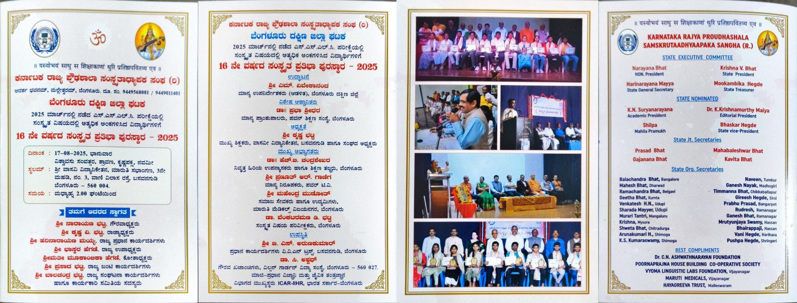 Prathibha Puraskar for the Sanskrit students of Karnataka State Board Examination organized by "KARNATAKATA RAJYA PROUDHASHALA SAMSKRUTAASHYAPAKA SANGHA"