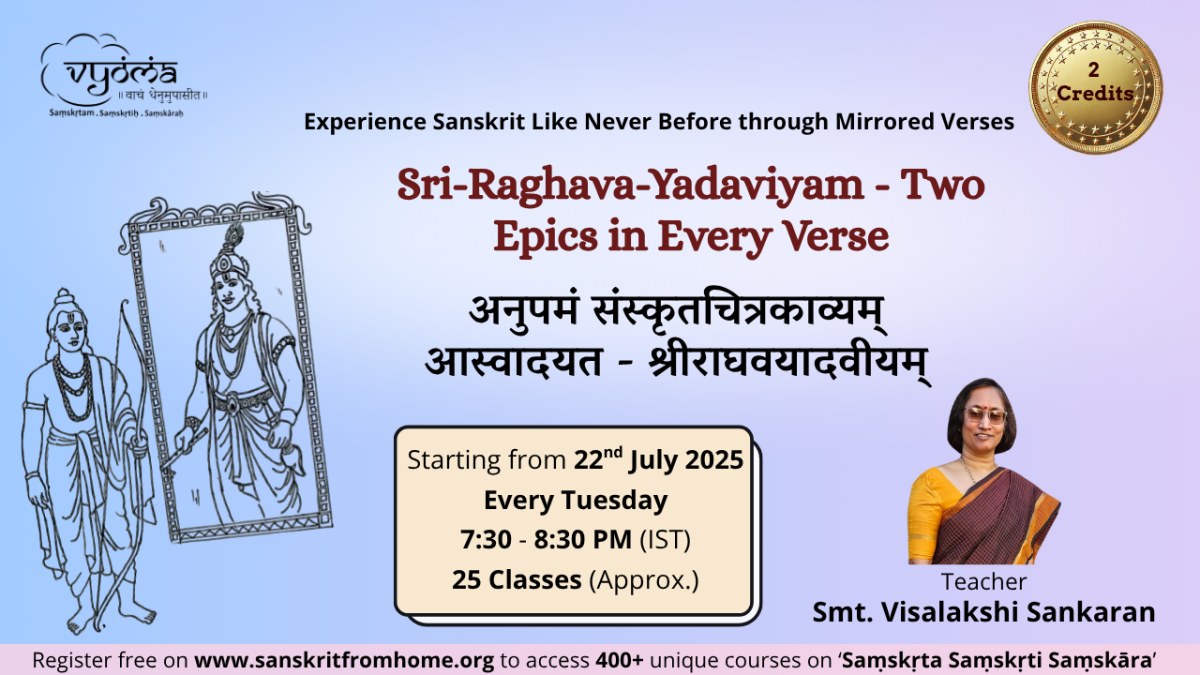 Raghava-Yadaviyam is a unique Sanskrit poem that tells two distinct narratives through the same verses. It recounts the story of Bhagavan Rama (Raghava) when read conventionally from left to right (anuloma). Conversely, reading the verses from right to left (pratiloma) unveils the tale of Bhagavan Krishna (Yadava) and the Parijata-apaharana incident. This makes it a palindromic or reversible poem, essentially encapsulating two epics within a single composition. This extraordinary linguistic and devotional masterpiece is brought to life by Smt. Visalakshi Sankaran, whose profound knowledge and insightful instruction illuminate the poem's intricate layers. The course Raghava-Yadaviyam offers a systematic and engaging study of this literary gem, revealing the poet's mastery and the depth of Sanskrit poetics.