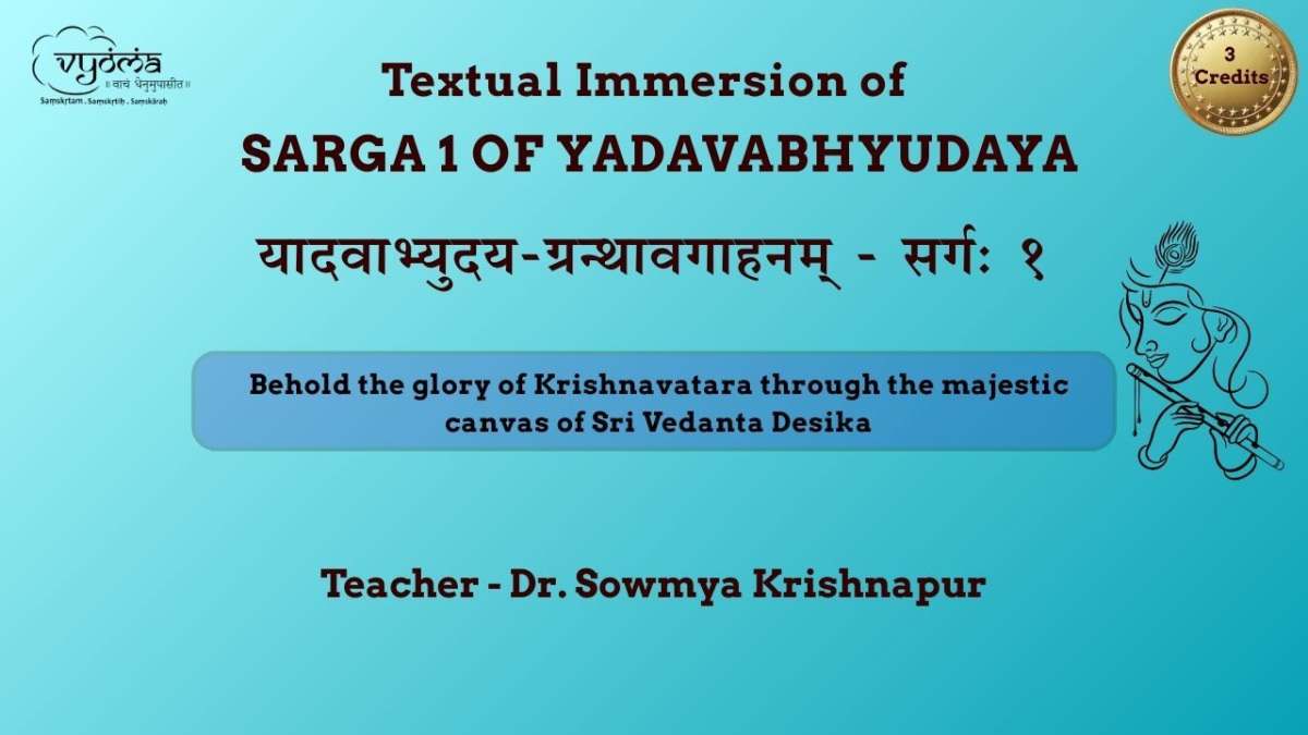 Yadavabhyudaya is a magnum opus of Sri Vedanta Desika. It is a Samskrita mahakavya in 24 sargas and over 2,600 verses, celebrating the divine life of Sri Krishna and the glorious Yadava lineage. Blending classical epic grandeur with the devotional essence of Vishishtadvaita Vedanta, it traces Krishna’s story from his birth to his reign in Dvaraka. The First Sarga of this work sets the foundation, introducing the Yaduvamsha and describing the plea of the Deva-s that led to Bhagavan Narayana’s decision to incarnate in the womb of Devaki. In this 3-credit course, Dr. Sowmya Krishnapur takes learners on a deep dive into the 100 verses of Sarga 1, uncovering the layers of linguistic and poetic richness through comprehensive explanations of each verse.